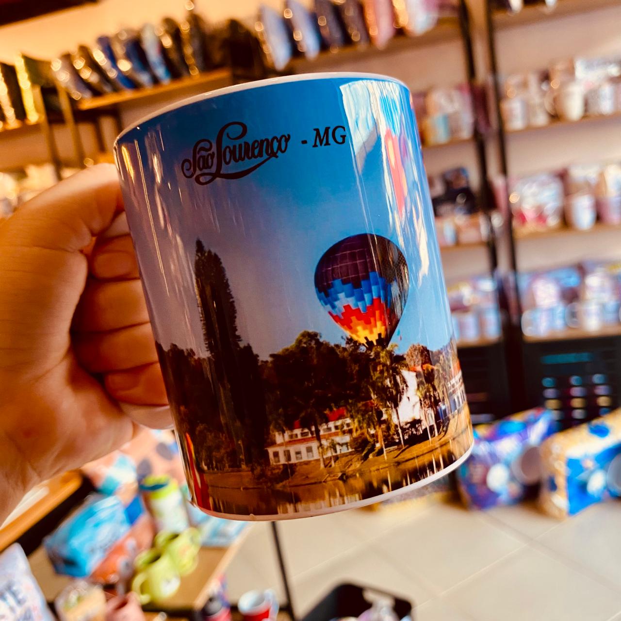 A Caneca de Porcelana São Lourenço traz um cenário encantador com três balões coloridos sobre o lago e o famoso balneário ao fundo, representando toda a beleza e tranquilidade desse destino turístico. Uma peça que une funcionalidade e lembrança especial, perfeita para colecionadores ou como presente único.