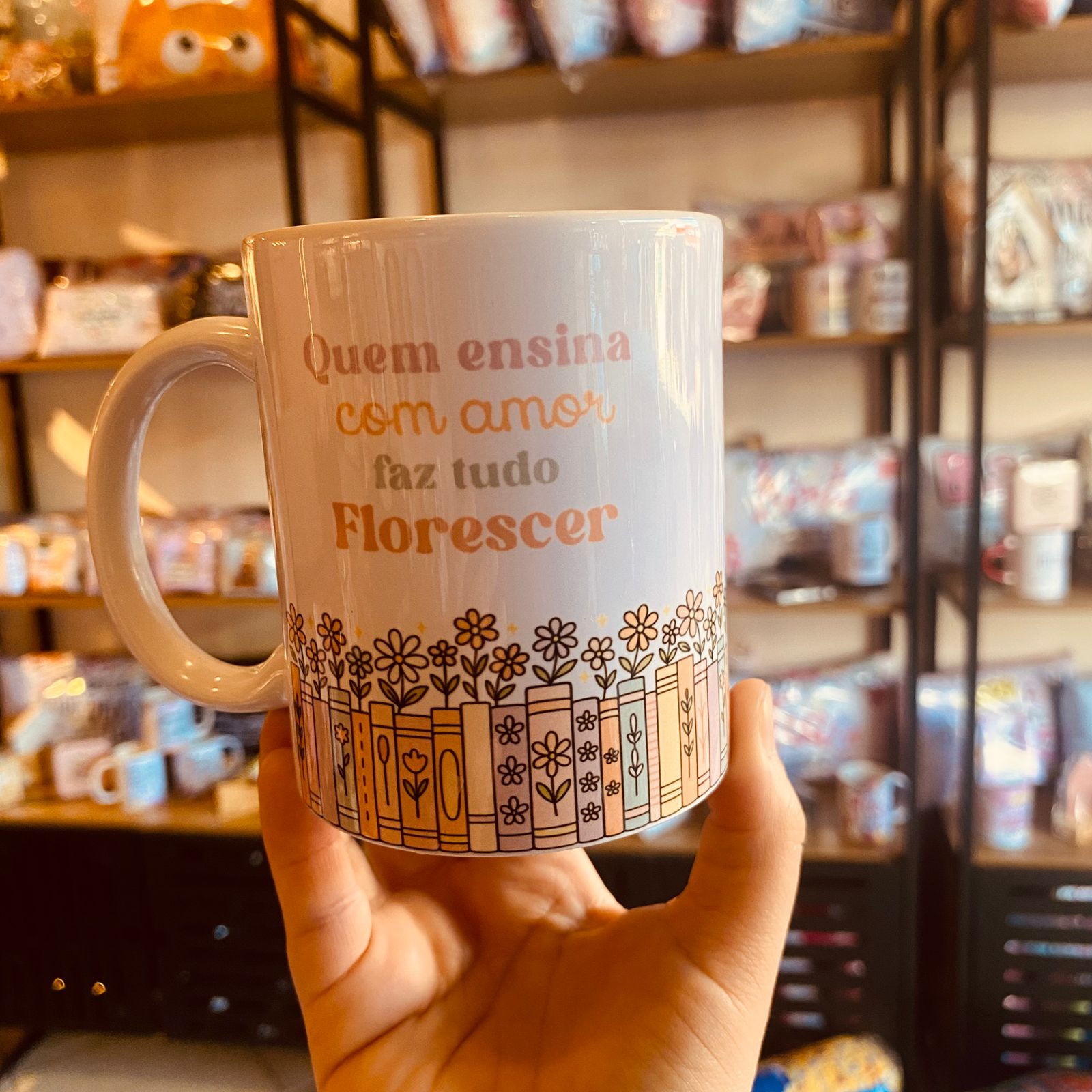 Caneca Porcelana 325ml – Quem Ensina com Amor Faz Tudo Florescer (Livros)