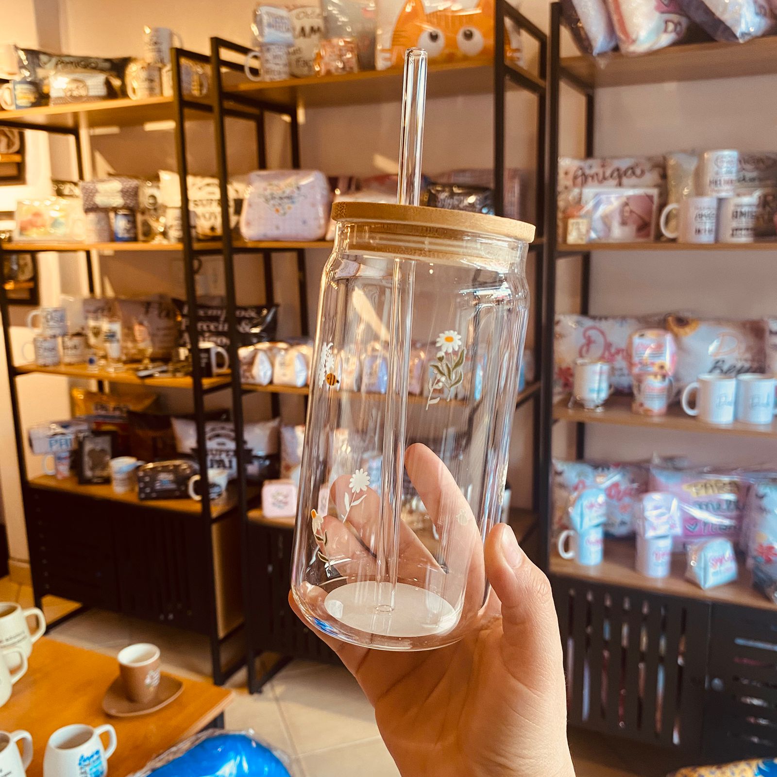 Copo de Vidro com Canudo e Tampa de Bambu 500ml