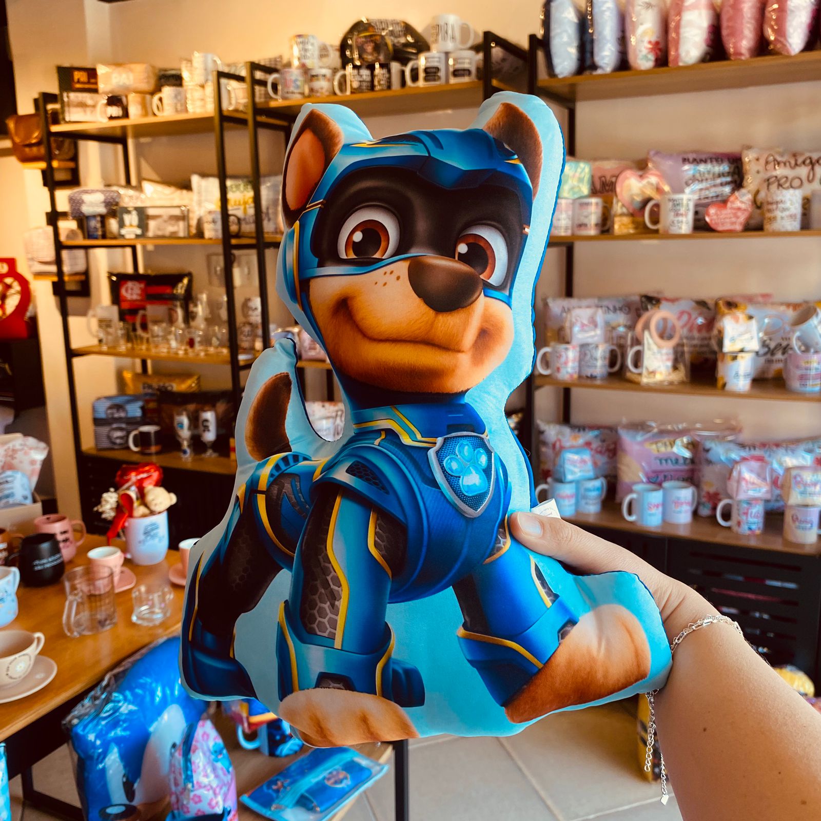 Perfeita para os fãs da Patrulha Canina, especialmente do corajoso Chase! A Almofada Contornada Chase traz o formato do personagem, com detalhes vibrantes e cheios de fofura, tornando qualquer ambiente mais divertido e aconchegante. Ideal para decorar quartos infantis, salas de brincadeira ou ser aquela companhia especial na hora do descanso.