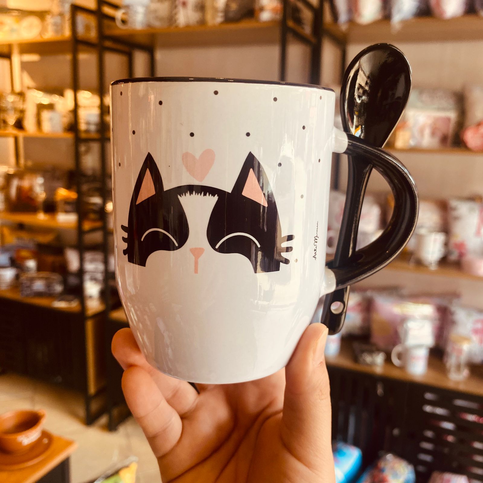 Caneca de Porcelana com Colher – Gato Frajola Poá 325ml
