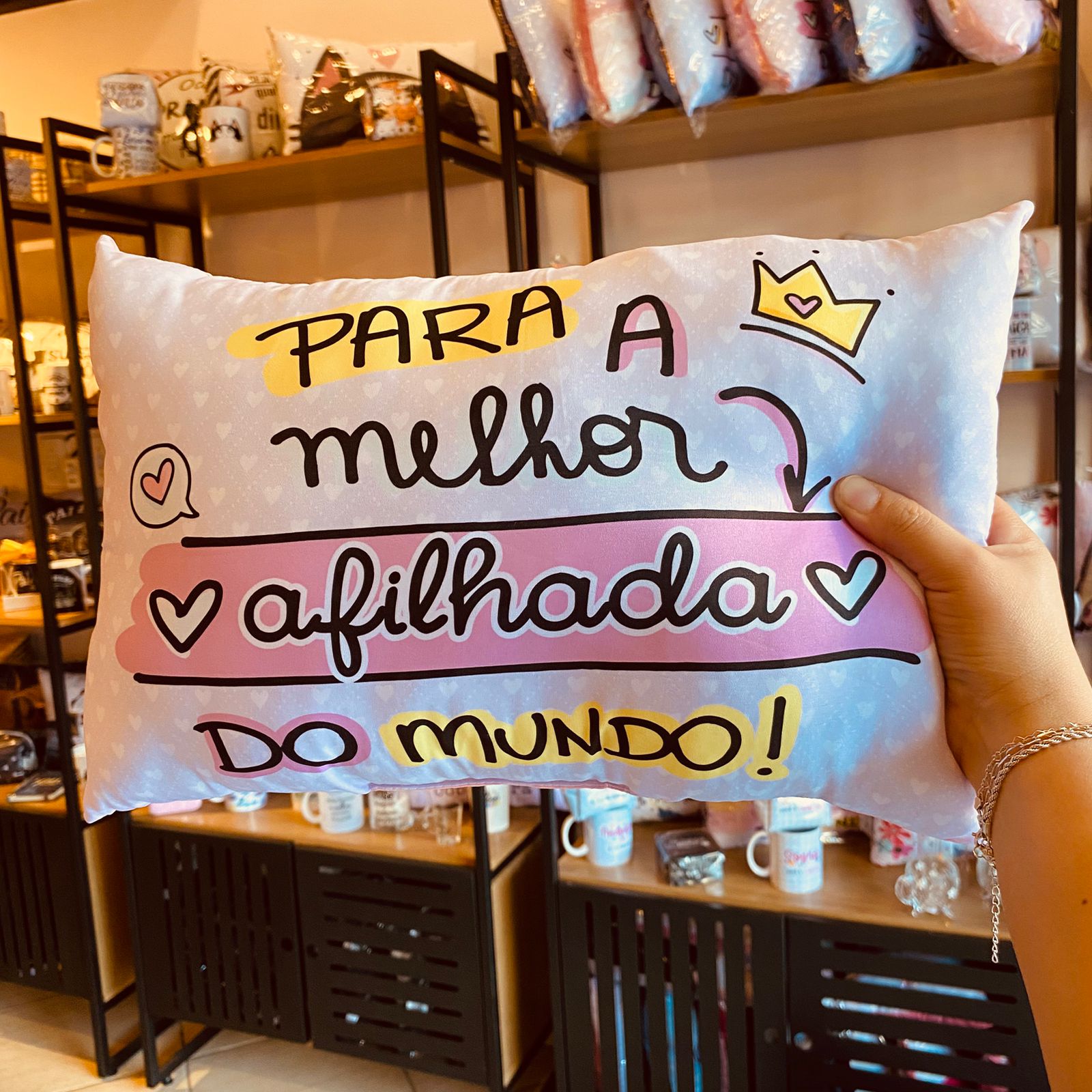 Uma almofada que une conforto e emoção, tornando-se o presente perfeito para deixar sua afilhada feliz e se sentindo ainda mais especial.