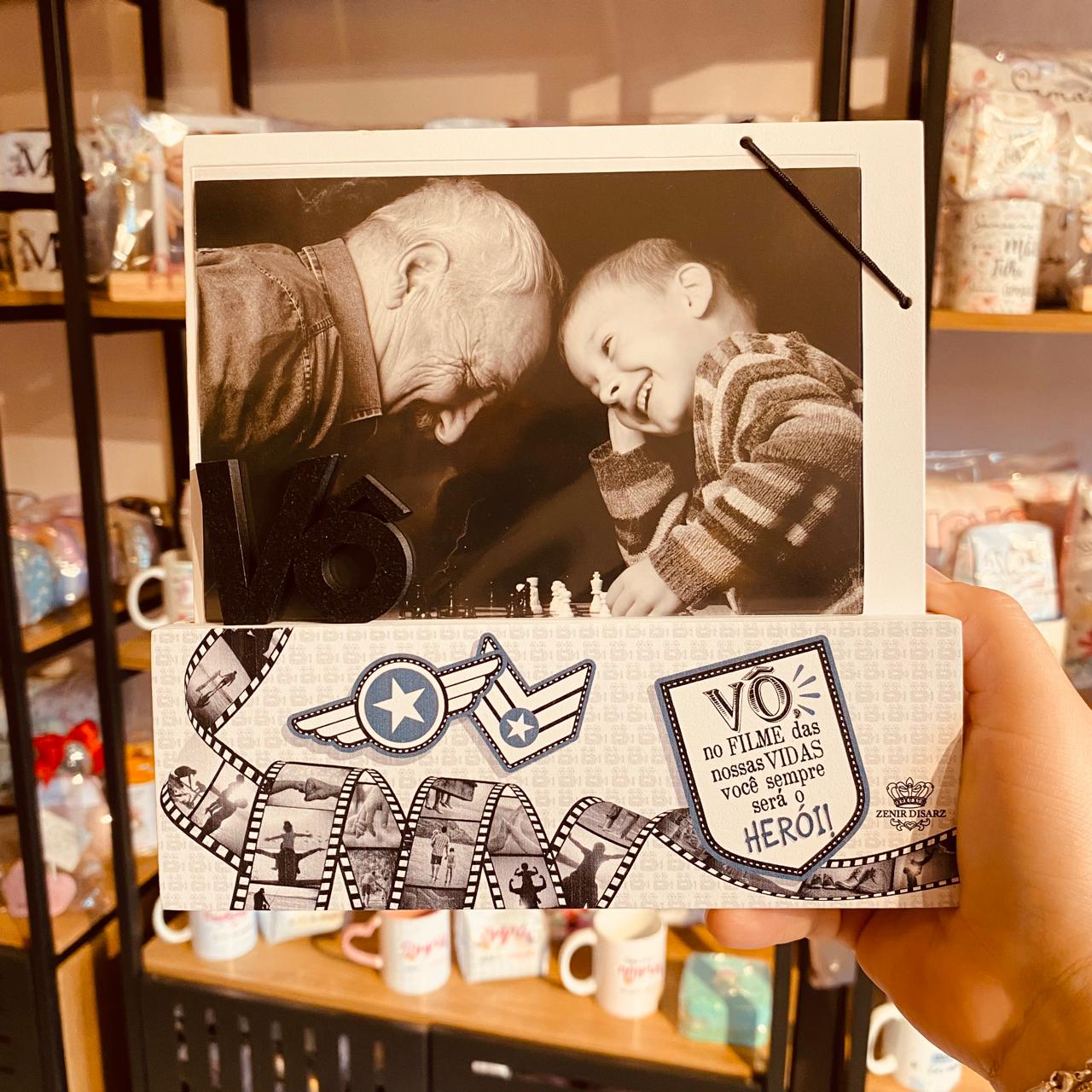O Porta-Retrato Madeirinha “Vô, no filme de nossas vidas…” é uma peça cheia de carinho, criada para eternizar momentos especiais ao lado do avô. Com visual delicado e acabamento aconchegante, ele traz uma mensagem afetiva que transforma qualquer foto em um verdadeiro tesouro.