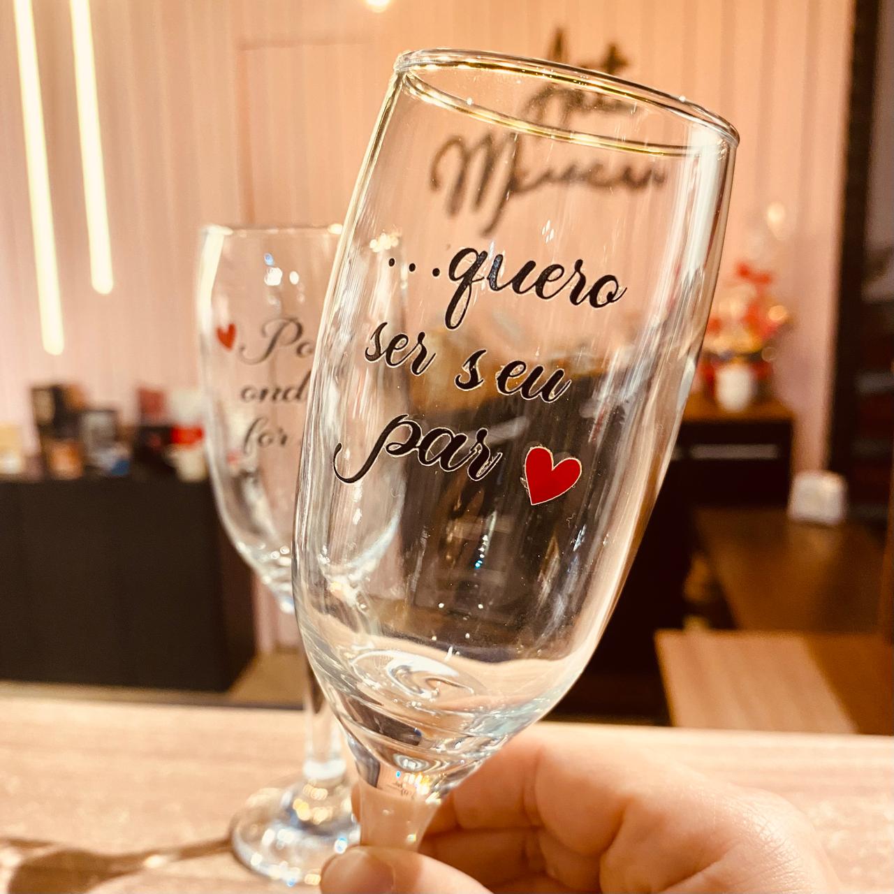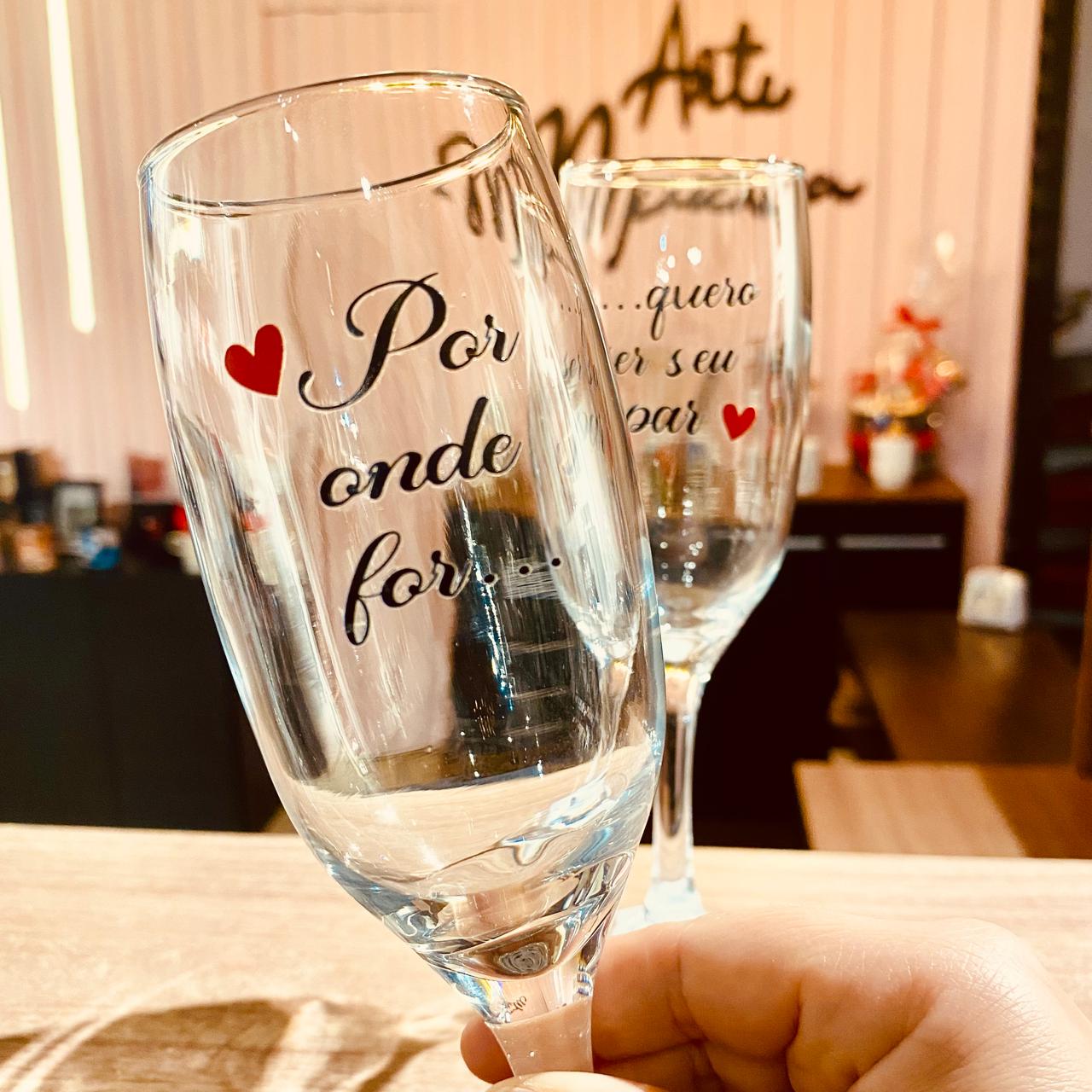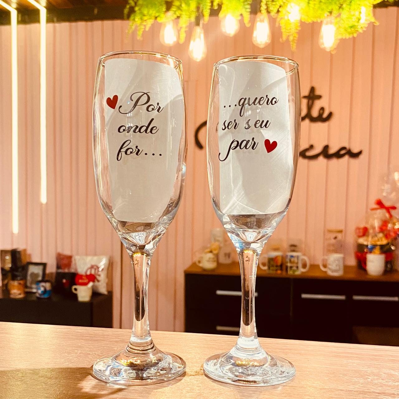 Celebre a sintonia do amor com o par de taças de champanhe com a frase “Por onde for, quero ser seu par”. Delicadas e significativas, essas taças são perfeitas para brindar a vida ao lado de quem faz cada momento valer a pena. Ideais para casais apaixonados que desejam eternizar o sentimento em um gesto simples, porém cheio de significado.