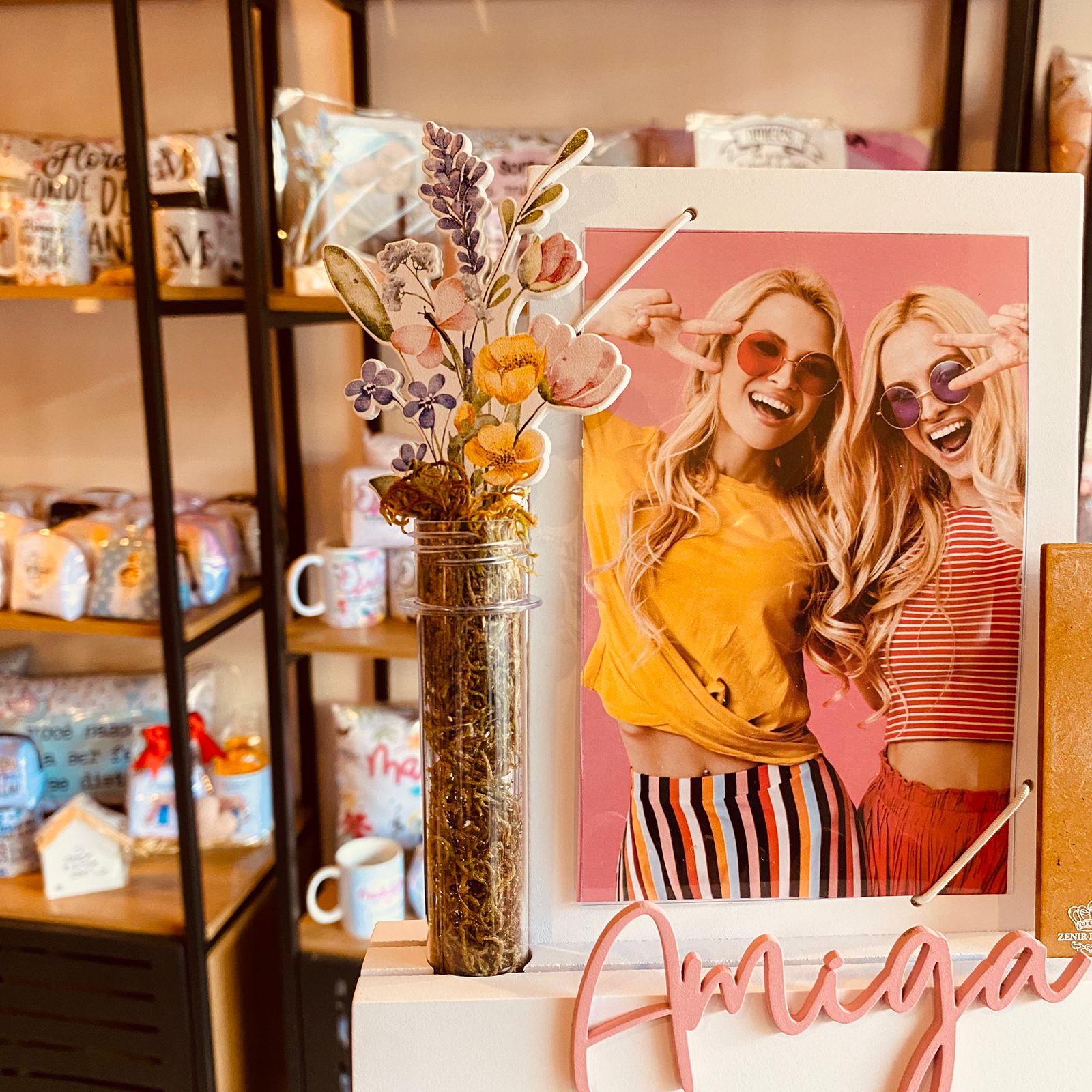 Celebre a amizade com um presente cheio de encanto, significado e delicadeza. O Porta-Retrato com Elástico, Placa e Tubete “Amiga Você É…” – Borboleta combina beleza, mensagem afetiva e detalhes que tornam a peça especial para decorar qualquer cantinho.